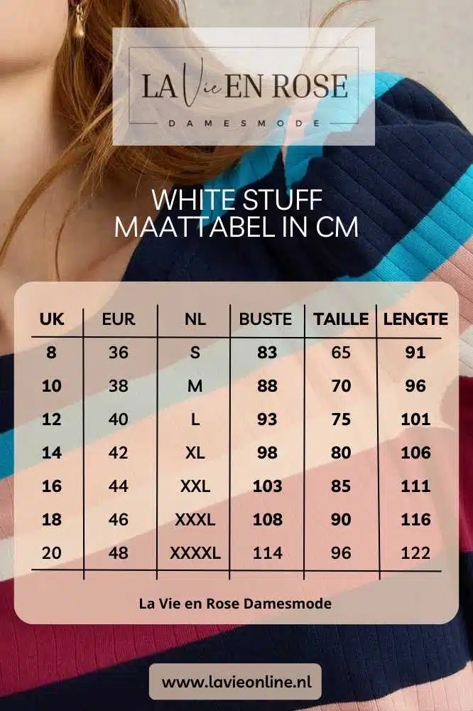White Stuff is een merk dat bekend staat om zijn comfortabele, stijlvolle en duurzame kleding. Ze combineren moderne ontwerpen met klassieke stijlen, altijd met aandacht voor detail en kwaliteit. White Stuff zet zich in voor ethische productieprocessen en gebruikt voornamelijk milieuvriendelijke materialen, zoals biologisch katoen, biologisch linnen, mulesing vrije wol en tencell. Het merk werd opgericht in 1985 en heeft sindsdien een reputatie opgebouwd voor hoogwaardige kleding die zowel modieus als duurzaam is. Hun collecties zijn geïnspireerd door het dagelijks leven en ze streven ernaar om kleding te maken die zowel functioneel als mooi is.