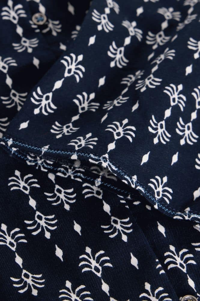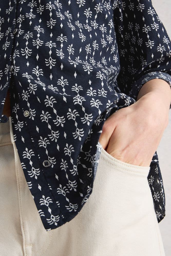 • ProductID / SKU: 444355 • Model draagt: maat 10, lengte 1,78 m • Pasvorm: relaxed/regular fit • Lengte maat 12: ca. 64 cm • Halslijn: V‑hals met subtiel knoopdetail • Mouwen: korte mouwen • Materiaal: 100 % biologische katoen (dobby geweven structuur) • Kleur: Navy Multi (marineblauw met speelse print) • Onderhoud: machinewasbaar op 30 °C