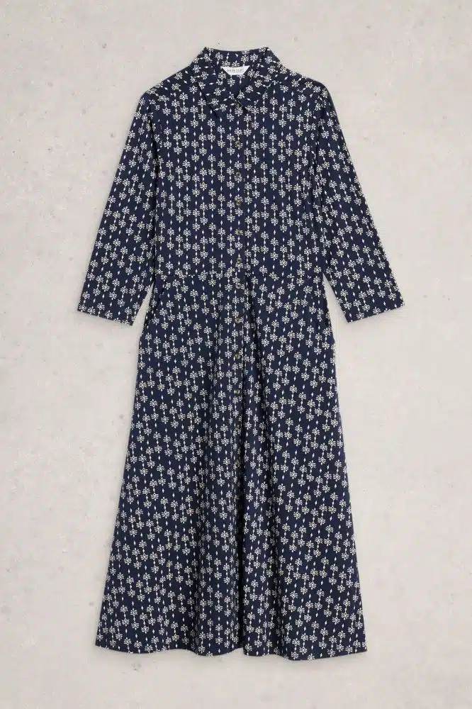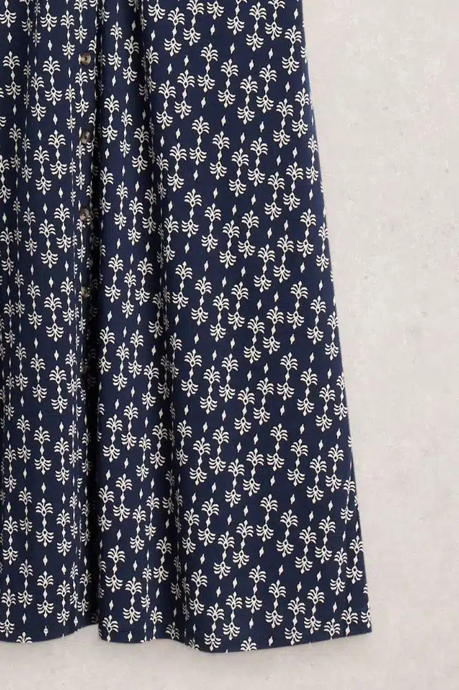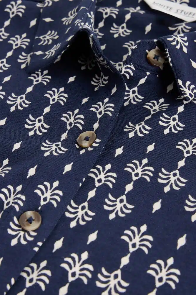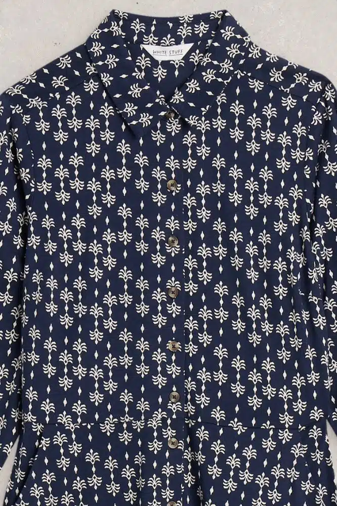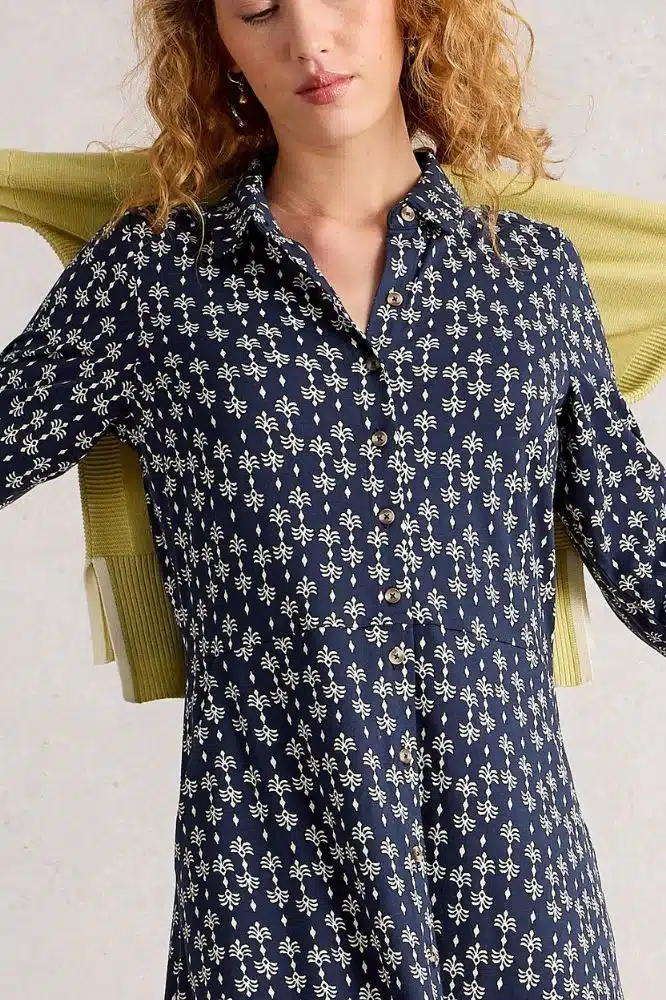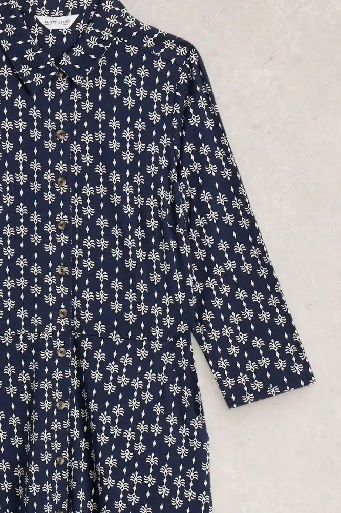 De Rua Jersey Shirt Dress Navy Print van White Stuff is een tijdloze toevoeging aan je garderobe. Deze jurk, met een elegante midi-lengte, combineert moeiteloos stijl en comfort. De 3/4-mouwen en het klassieke overhemdontwerp maken het een veelzijdige keuze voor verschillende gelegenheden. Het zachte, ademende materiaal maakt het ideaal voor dagelijks gebruik, terwijl de opvallende navy print een vleugje verfijning toevoegt.