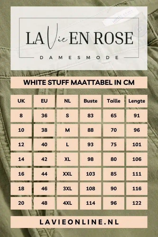 White Stuff is een geliefd Brits merk dat bekend staat om zijn eigentijdse, draagbare mode met een duurzaam karakter. Ze combineren stijlvolle ontwerpen met hoogwaardige materialen en ethische productiemethoden. Met aandacht voor detail en een focus op milieuvriendelijke materialen creëert White Stuff collecties die perfect aansluiten bij de moderne, bewuste consument.