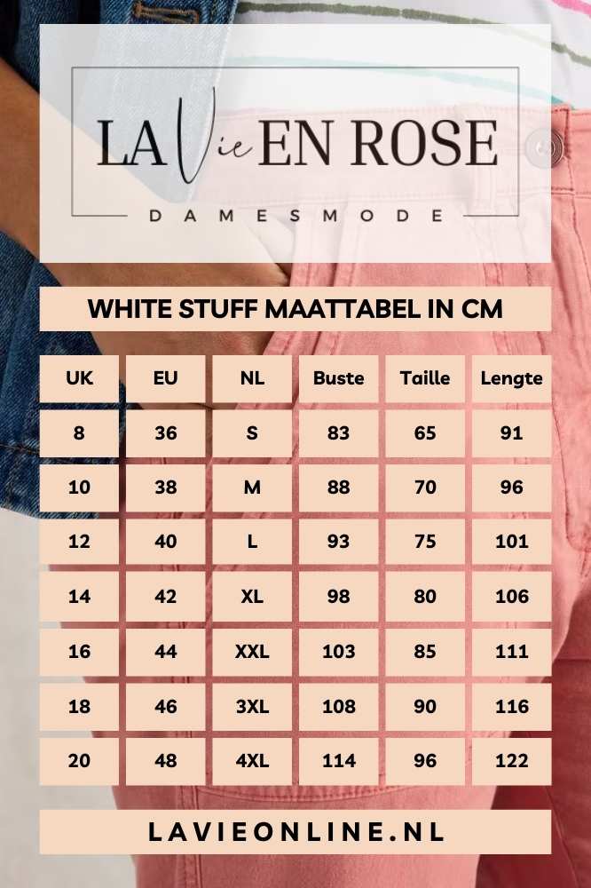 White Stuff is een geliefd Brits merk dat bekend staat om zijn eigentijdse, draagbare mode met een duurzaam karakter. Ze combineren stijlvolle ontwerpen met hoogwaardige materialen en ethische productiemethoden. Met aandacht voor detail en een focus op milieuvriendelijke materialen creëert White Stuff collecties die perfect aansluiten bij de moderne, bewuste consument.