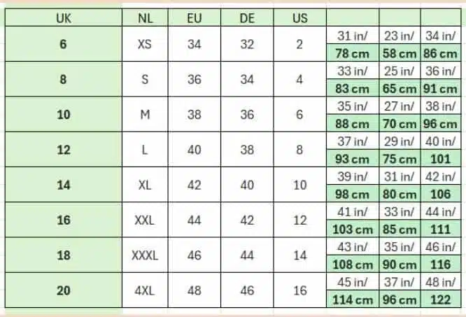 Binnenbeenlengte maat UK 12: ca. 58 cm