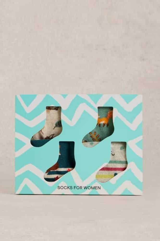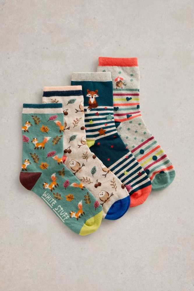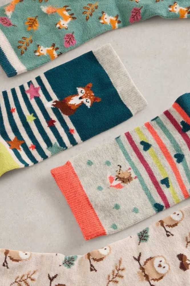 De Woodland Animals Socks 4 Pack van White Stuff biedt comfort, speelse patronen en duurzaamheid in één. Deze set van vier paar enkelsokken is gemaakt van een mix van biologisch katoen en is ideaal voor dagelijks gebruik. De sokken zijn versierd met schattige bosdieren, vrolijke strepen en stippen, wat een vleugje plezier toevoegt aan je outfit. Door de zachte stof en ademende eigenschappen zijn deze sokken niet alleen stijlvol, maar ook functioneel. Deze leuke White Stuff sokken zijn verkrijgbaar in meerdere prints. Kijk ook bij de White Stuff panty’s, gemaakt met biologisch katoen!