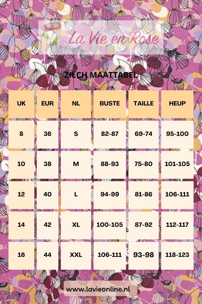 Zilch is een Nederlands merk dat zich richt op het creëren van kleurrijke en duurzame mode voor vrouwen. Het merk staat bekend om zijn ethische productiemethoden en het gebruik van milieuvriendelijke materialen, zoals biologisch katoen en Ecovero. Zilch streeft ernaar om mode te bieden die niet alleen stijlvol is, maar ook bijdraagt aan een betere wereld. Elk kledingstuk van Zilch is met zorg en aandacht ontworpen, waardoor je verzekerd bent van een duurzame en tijdloze garderobe.