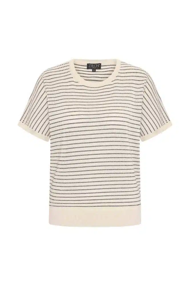 De Top Stripe Navy van Zilch is een elegante en comfortabele top, perfect voor de lente en het najaar. Het breisel van 100% organisch katoen heeft een stijlvol stipjes-streeppatroon dat de top een speelse, maar verfijnde uitstraling geeft. De top heeft een boxy pasvorm, wat zorgt voor een relaxte look die zowel casual als chic gedragen kan worden. De ronde hals en korte mouwen zijn afgewerkt met een subtiele boord, wat de top een nette en afgewerkte uitstraling geeft. De onderzijde is eveneens voorzien van een boord, waardoor de top een moderne uitstraling heeft.