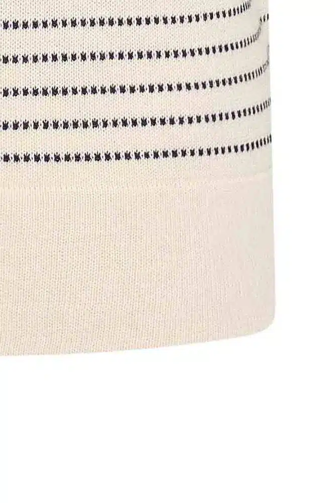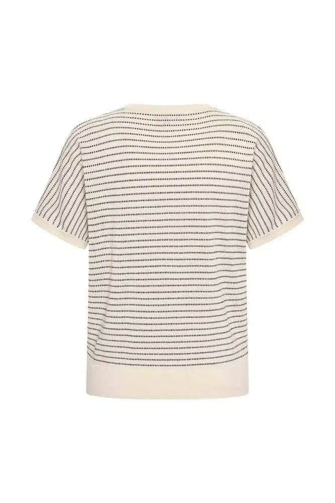 Met een lengte van 60,5 cm in maat L biedt de top de ideale balans tussen een flatterende pasvorm en voldoende bewegingsvrijheid. Dankzij de luxe uitstraling van het ingebreide patroon, kan de Top Stripe Navy zowel op een jeans als een nette broek gedragen worden voor verschillende gelegenheden.